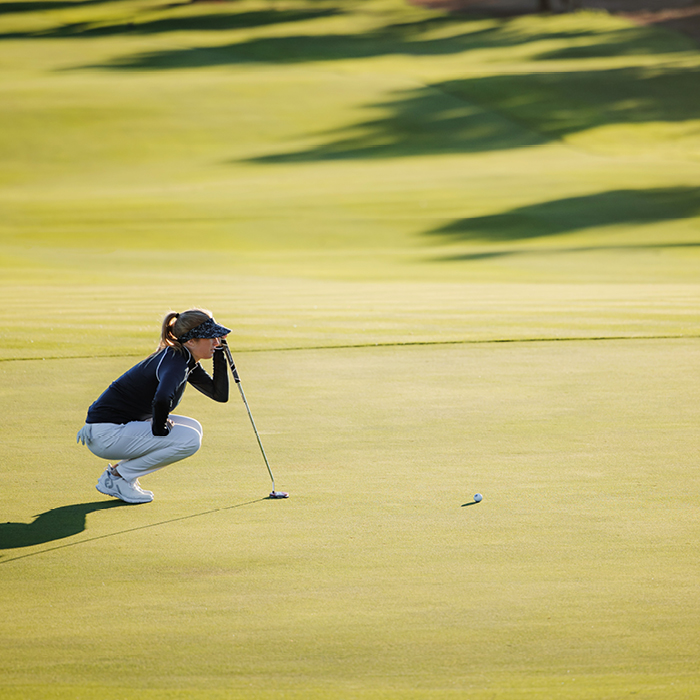 Kijk samen met je pro naar je manier van putten om uit te zoeken welk type putter het best bij je past. Wil je een rechte putt stroke of een boogvormige beweging? Hoe gebruik je je handen bij het slaan? Wat zijn je voorkeuren als het gaat om gripdikte, putterlengte en type clubhoofd? Kies altijd een putter met een look die je bevalt. Je gebruikt je putter algauw zo’n 30–40 keer per ronde en dan wil je daar een goed gevoel bij hebben. Een technische speler zal meestal een putter met hoekige vormen willen, terwijl een gevoelsspeler voor een putter met zachtere lijnen zal opteren. Als je een putter uitprobeert, is het belangrijk dat je dat op gras doet – het liefst op greens waar je vaak speelt – om te zien hoe de bal zich gedraagt wanneer je hem met verschillende snelheden slaat.