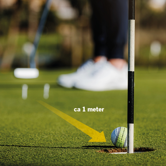 Deze oefening is goed om meer zelfvertrouwen op de green te krijgen en om je kansen op pars en birdies te verhogen. Sla vanaf het midden van de oefengreen naar verschillende vlaggen, bijvoorbeeld zes verschillende afstanden en richtingen. Is de puttafstand meer dan vijf meter, kies dan een uitgangsrichting uit en ga na met welke snelheid je moet putten op basis van de helling van de green langs je startlijn. Neem een beslissing, houd je eraan en sla je putts. Hoeveel ballen sla je tot binnen een meter van hole? Als je het onder de knie krijgt om de bal dicht bij de hole te slaan, heb je aanzienlijk meer kans op tweeputts en bovendien heb je daarmee de mogelijkheid met zo’n putt ook een birdie te halen.
