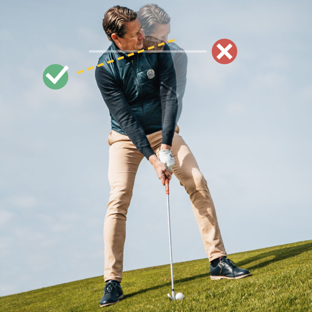 Als je een approach shot naar een verhoogde green mist, komt de bal vaak op een oplopende helling te liggen. Probeer dan je schouders parallel met de ondergrond te houden en leg je gewicht op je rechtervoet, anders riskeer je een duff. Op een aflopende helling raak je de grond misschien helemaal niet en swing je over de bal heen.