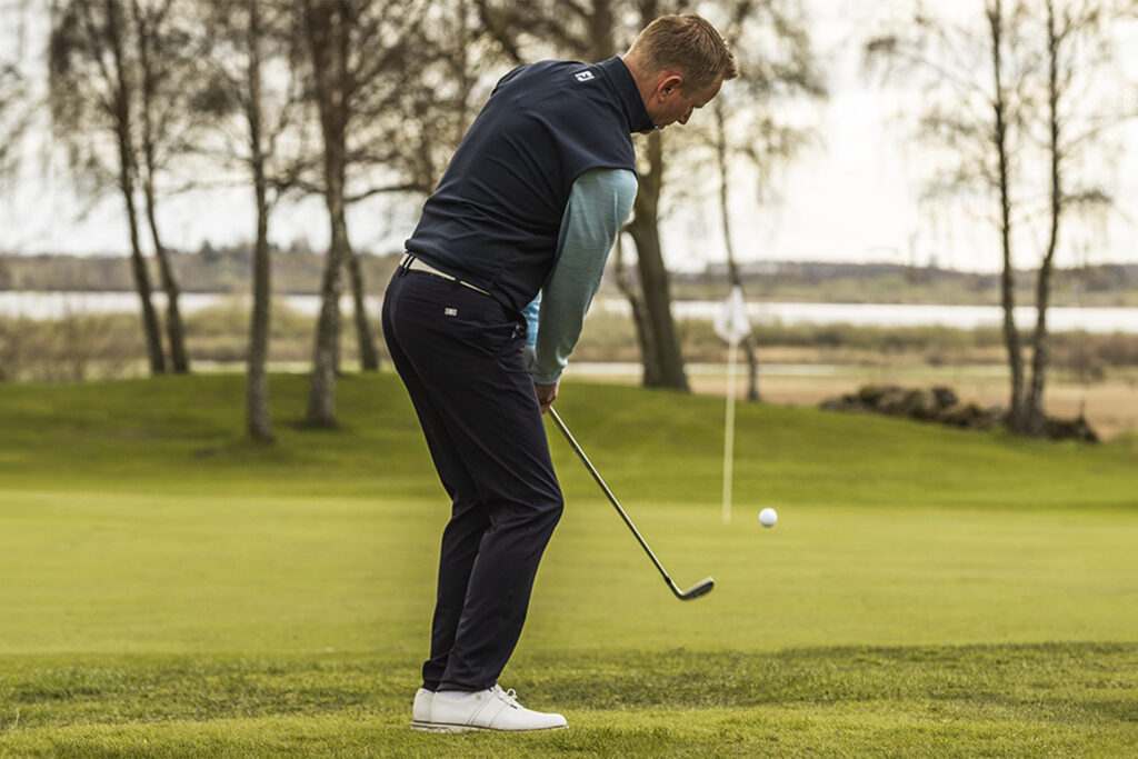 Let op de plaats van de bal. Je slaat de bal precies onder het middelpunt van je lichaam, dus recht voor je borstbeen. Houd je voeten wat dichter bij elkaar dan normaal. Aangezien je een korte beweging maakt, is je evenwicht hier niet zo’n punt. Voor een zuivere impact heb je een licht voorwaartse shaft lean nodig en je handen blijven passief tijdens de slag, maar niet gespannen. Zorg dat je bij de impact de druk naar de voorste voet verplaatst.