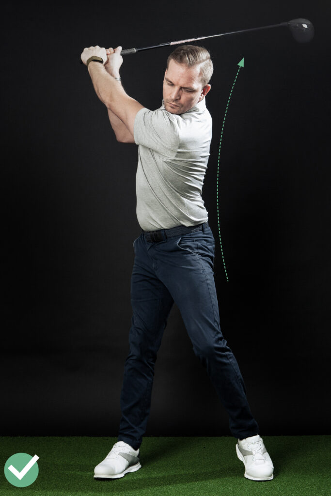 Benadruk je achterzwaai en maak hem langer door in een zo groot mogelijke cirkel te swingen. Daarvoor strek je je bovenrug en verhoog je het zwaartepunt van je lichaam. Op de afbeelding rechts zie je hoe Erik zich helemaal uitstrekt. Het is de breedte van de cirkelbeweging die de nodige snelheid geeft. In het voorbeeld links zie je hoe het niet moet. Vanuit deze ineengedoken houding krijg je geen snelheid.